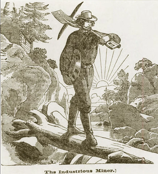 Arising early, firm of purpose, the industrious miner heads to the diggings....